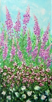 The dimensions of these canvases are ideal for full scale paintings of flowers in the wild. In nearly all of them I have taken three contemporaneous plants of different size and painted them in a vertical slice of gloriously coloured nature! With the exception of Thistle and Alexander amongst the Golden Corn above which is painted on a deep edge canvas, they are all framed in simple white wood as can be seen on the wild flower contents page.